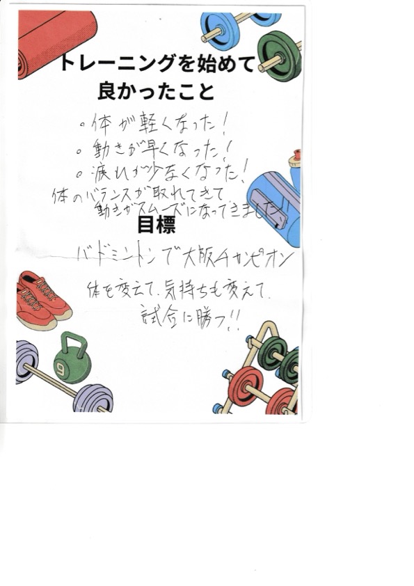 バドミントンで大阪チャンピオンを目標にトレーニングを続けられており、体のバランスが改善されたと嬉しいお声をいただきました。